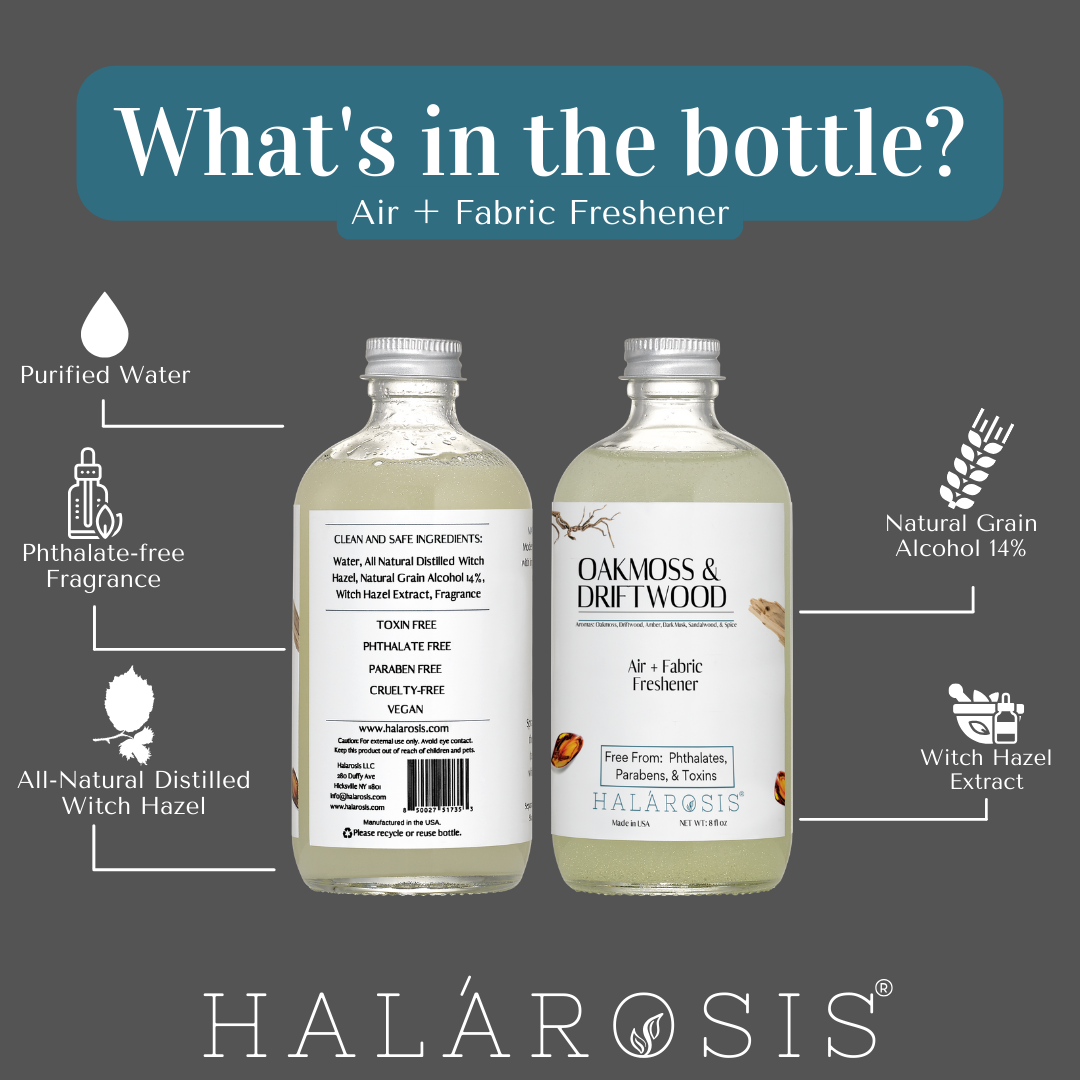 Please visit the About Our Products page for more info about the ingredients that are used in Halarosis Air + Fabric Fresheners.